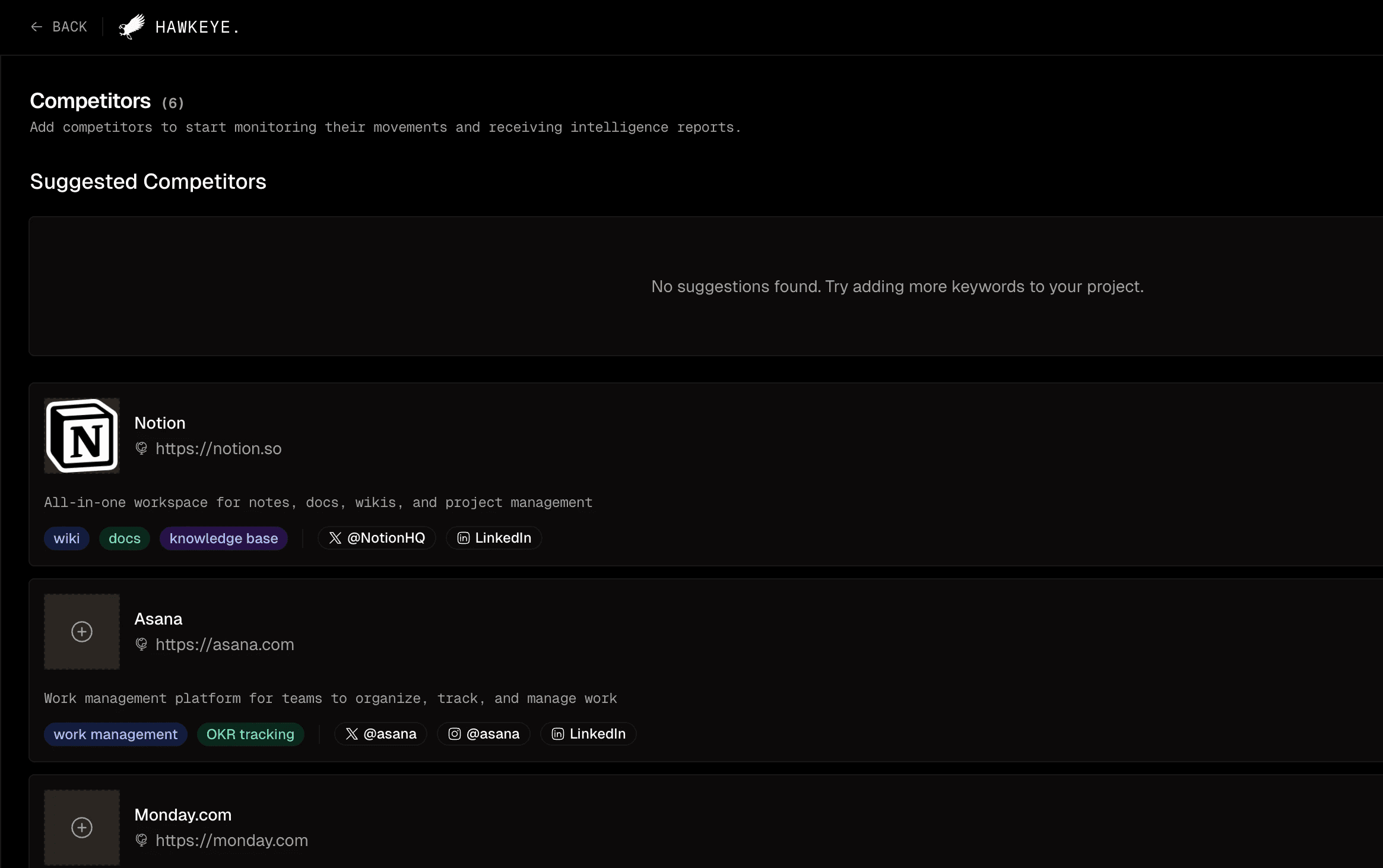 From one project to many competitors, Hawkeye stays useful as your competitive set grows.