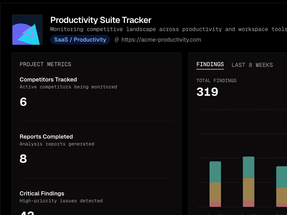 Continuously track web, pricing, and messaging. Get findings with clear priority, context, and recommendations—so you can act before it's too late.