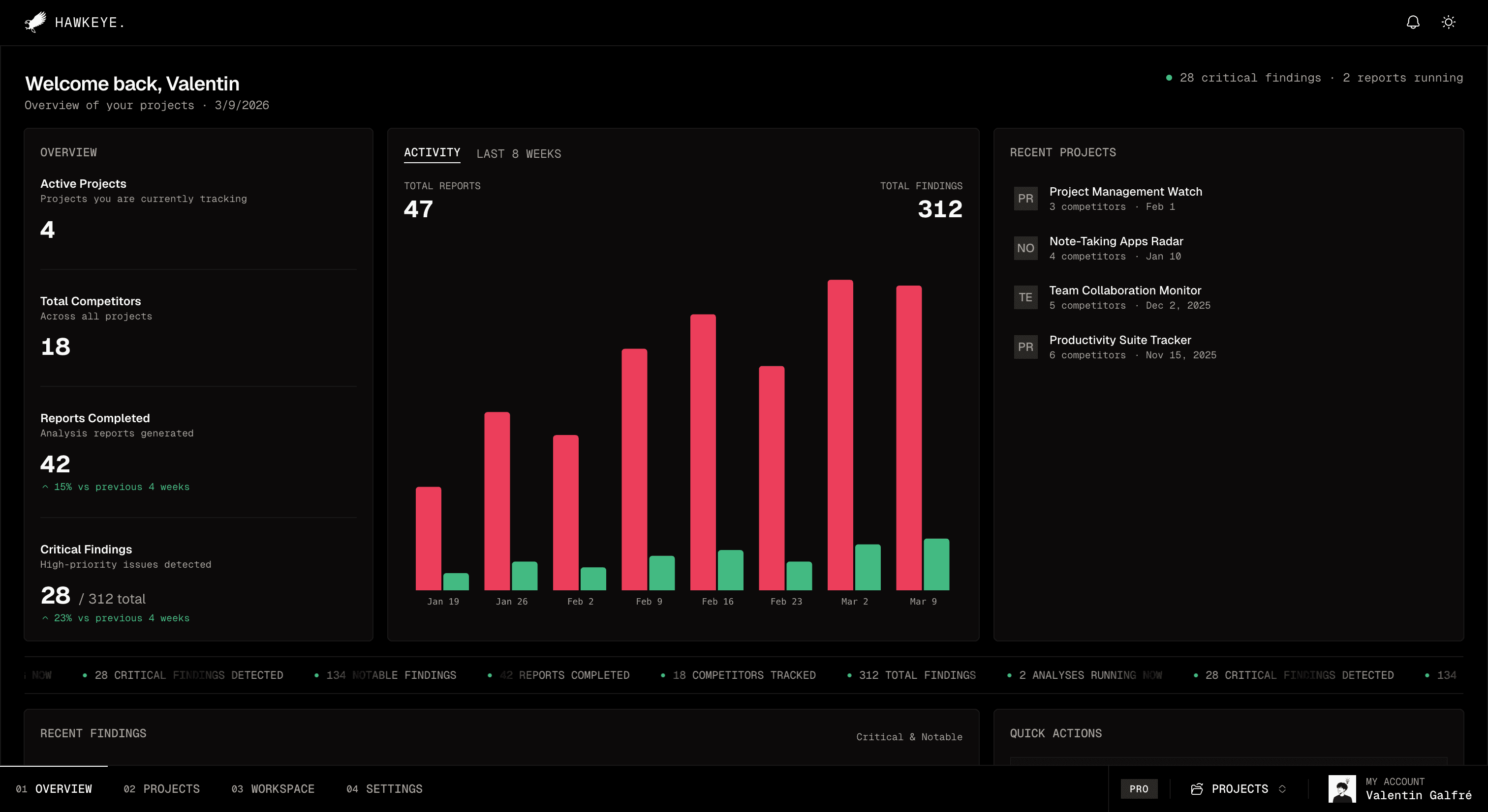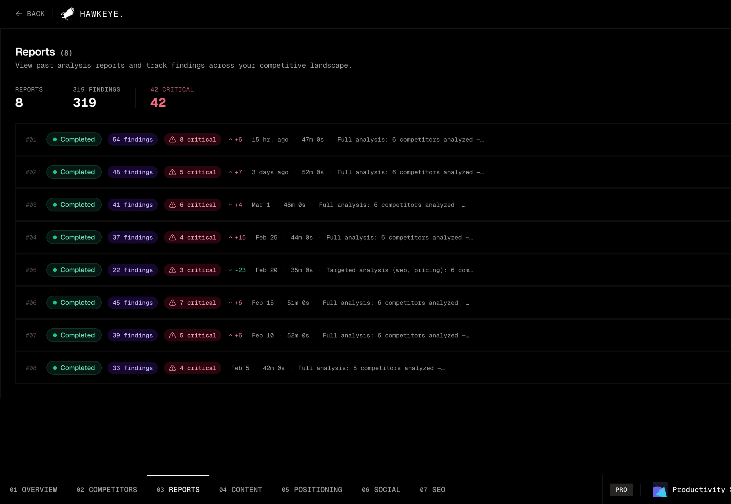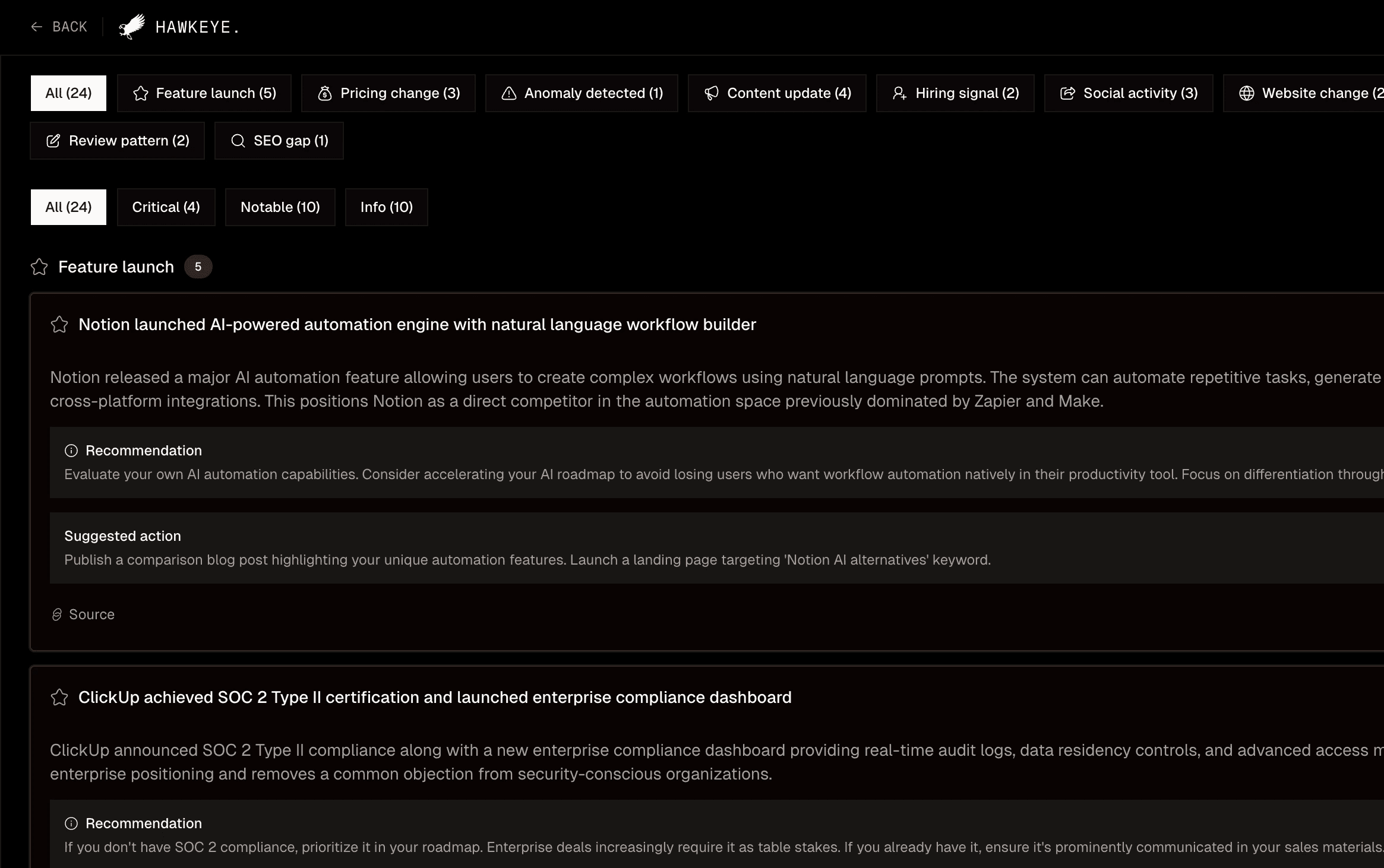 Hawkeye tracks web, pricing, news, and social signals so you see competitor moves as they happen.