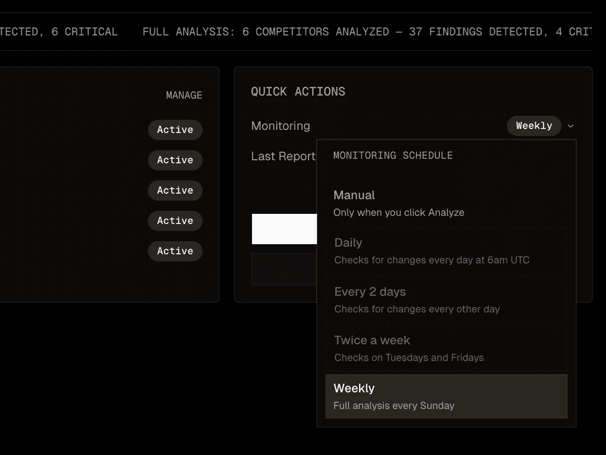 On the free plan you run analysis manually whenever you want. On Pro, monitoring runs weekly; on Business, daily. Each run fetches the latest web, pricing, news, and (on paid plans) social signals so your reports stay current.