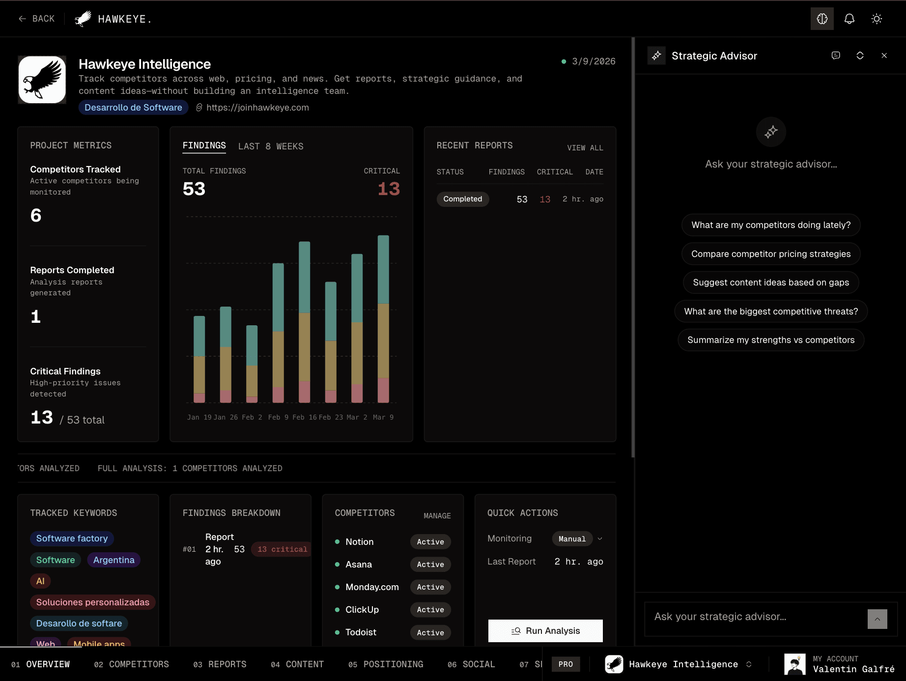 Hawkeye is built for founders, marketers, and lean teams in Latin America who need competitive awareness without building an in-house intelligence function. Solo operators, consultants, and small teams get the most value: one project, a few competitors, and reports you can act on.